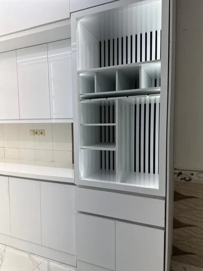 یکی دیگر از پروژههای زیبای مجموعهی ما در روستای دیرستان قشم، اجرای کابینت دو پله هایگلاس سفید همراه با کافهبار شیک و درب پروفیل آلومینیومی است.