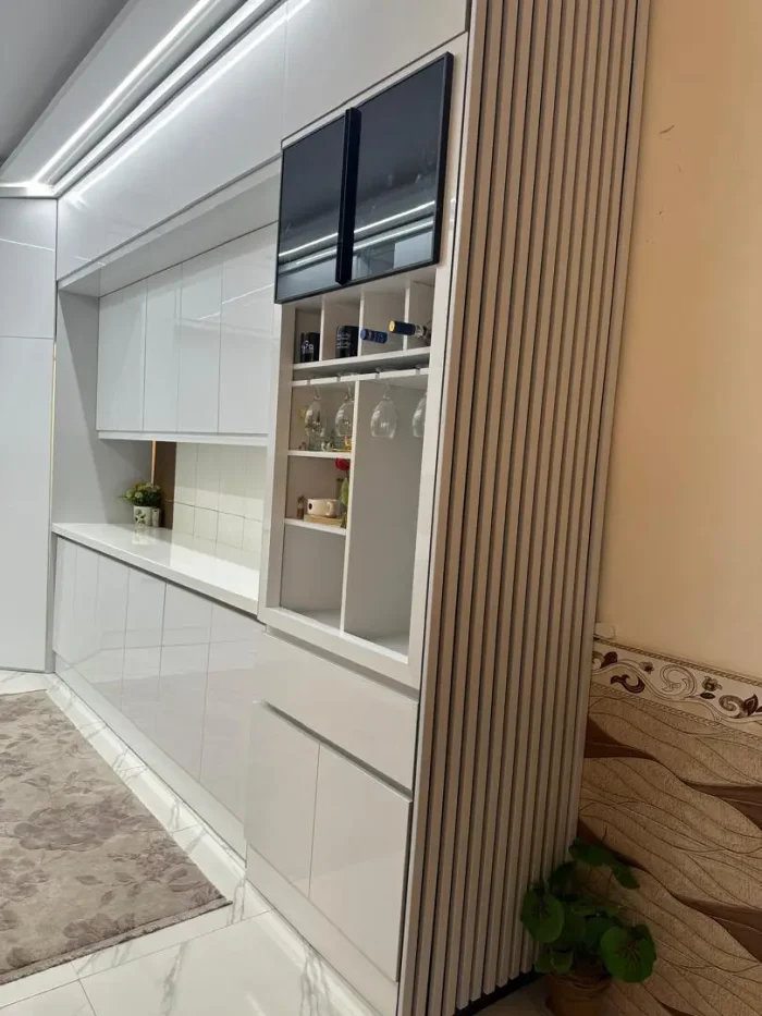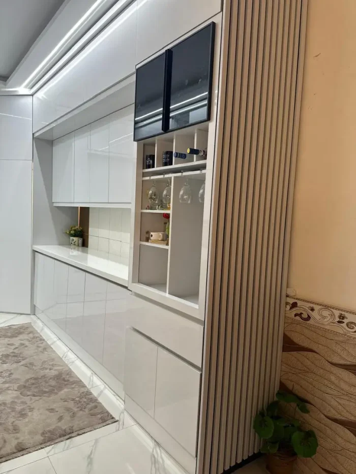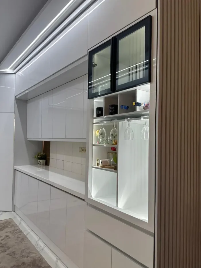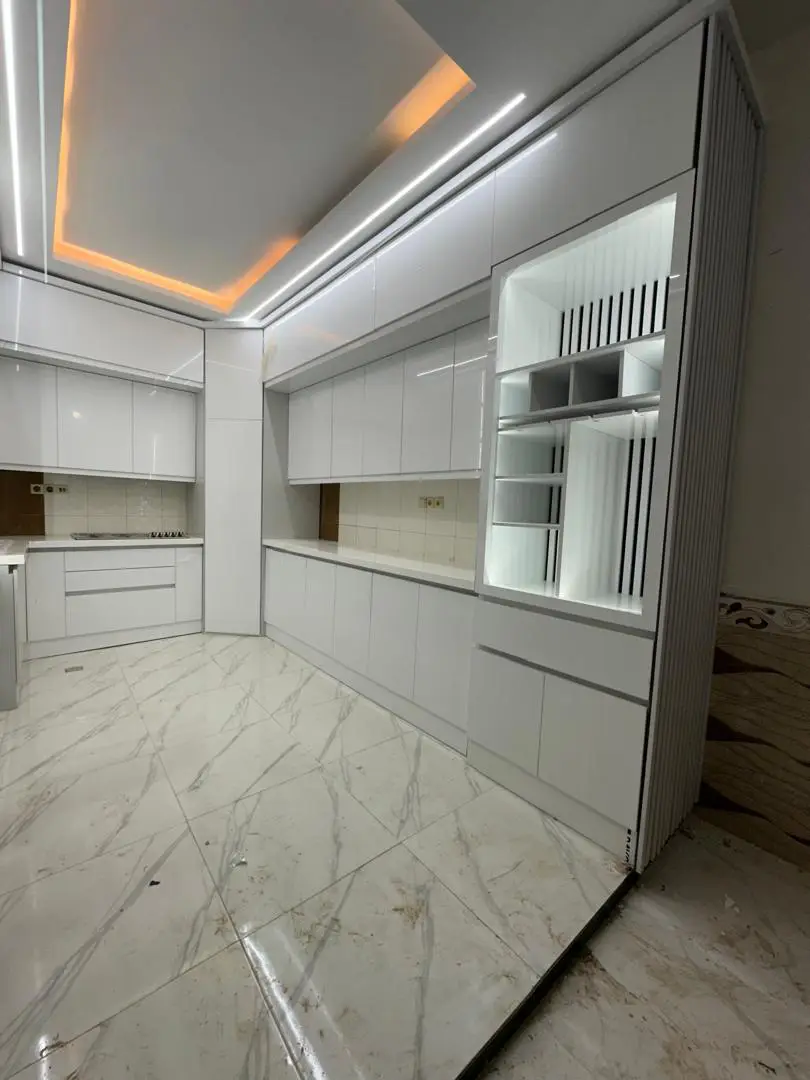 کابینت دو پله هایگلاس سفید همراه کافهبار | پروژه خاص روستای دیرستان